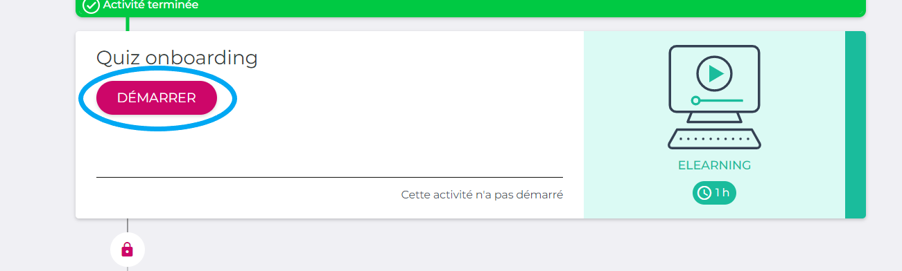 Entre deux modules, l’apprenant pourra voir apparaître un cadenas, cela signifie qu’il devra réaliser les modules dans l’ordre chronologique pour pouvoir débloquer les suivants au fur et à mesure. Du côté du formateur, cela voudra dire que celui-ci a opté pour une complétion à 100%. (cf Création / Parcours / Éditer un parcours).