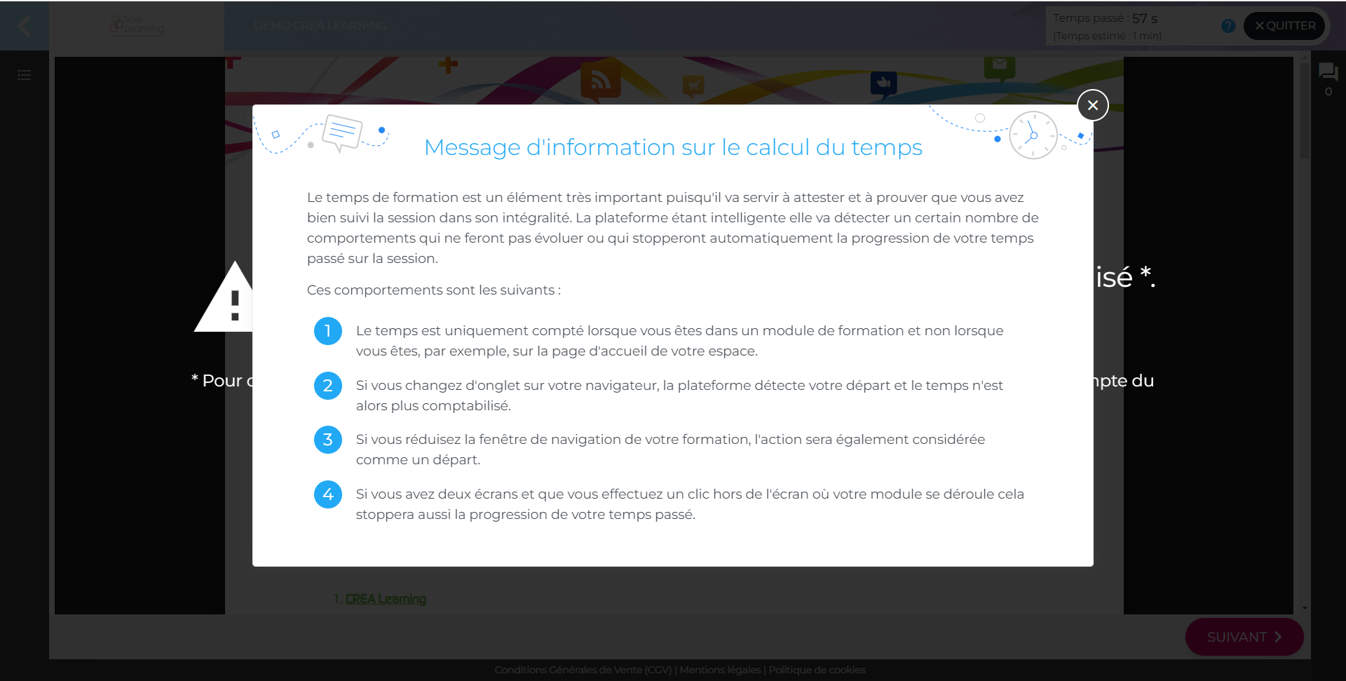 Une fois la formation choisie, il devra cliquer sur “Commencer ma formation”. Un message explicatif apparaît pour expliquer à l’apprenant comment fonctionne le calcul du temps lors de la formation.
