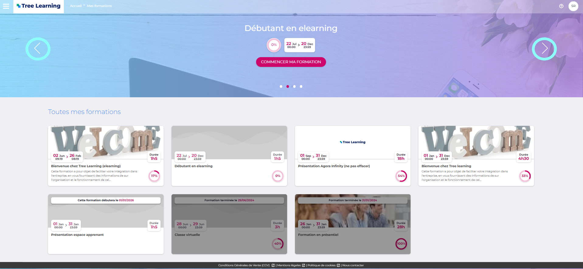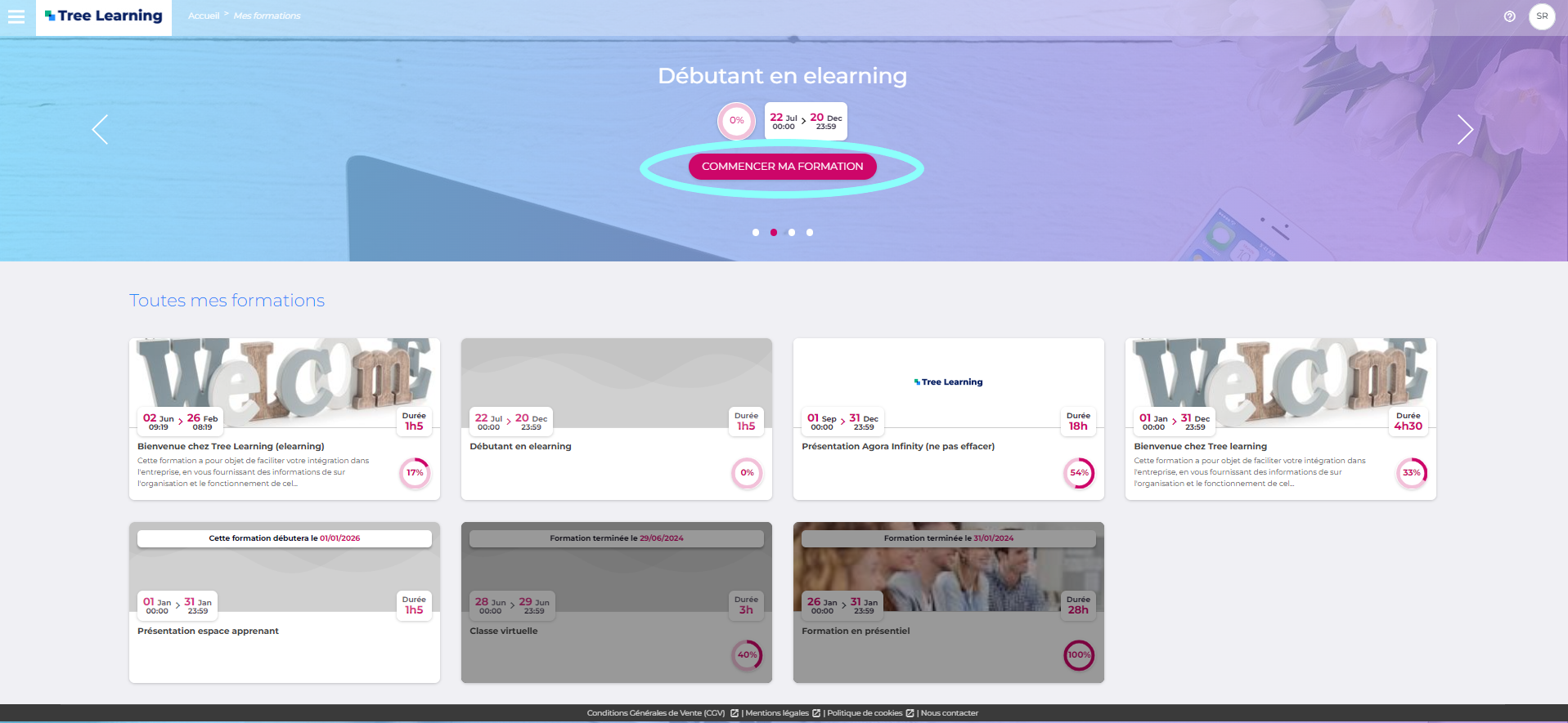 Une fois connecté à son espace, l’apprenant n’aura qu’à choisir la formation qu’il souhaite. Il pourra passer d’une formation à l’autre à l’aide des flèches ou choisir sa formation visibles dans les cartes en dessous.