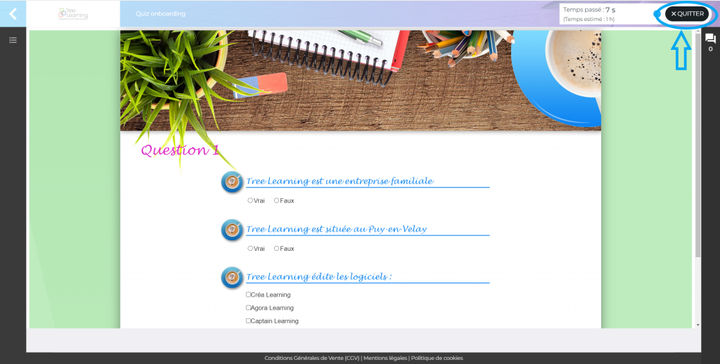 Pour commencer le module, il faudra cliquer sur le bouton “démarrer”. A la fin de celui-ci, un simple clic sur “quitter” en haut à droite suffit.