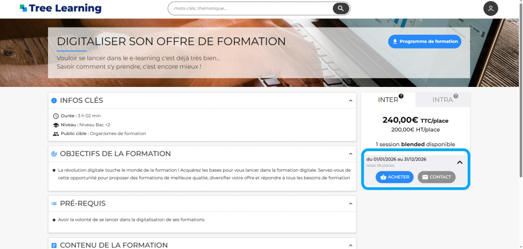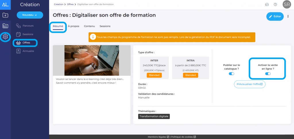 Pour visualiser l’offre accessible à la vente en ligne, retournez sur l’accueil et cliquez sur “Offre”. Sélectionnez l’offre qui sera accessible à la vente en ligne et activez la vente en ligne sur la droite.