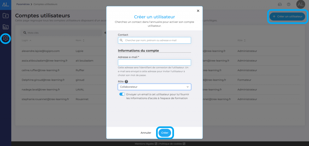 Dans ”Paramètres” > ”Comptes utilisateurs”, vous verrez apparaître les utilisateurs utilisant la plateforme côté Admin avec le rôle de chacun.