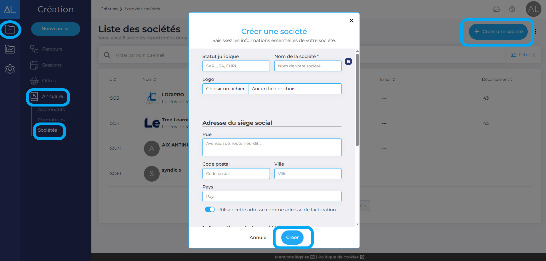 Dans l’onglet « Création » de la plateforme, rendez-vous sur l’annuaire. Sélectionnez “Sociétés” dans le menu à gauche. En haut à droite, vous trouverez l’onglet “Créer une société” où vous pourrez remplir toutes les informations nécessaires.