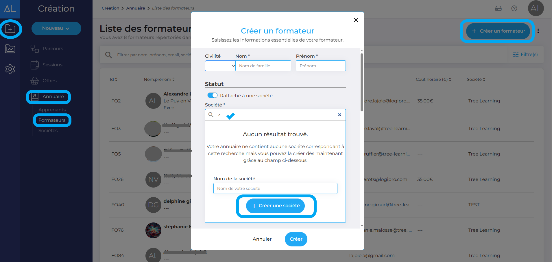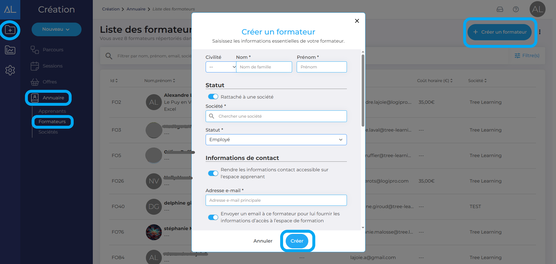 Pour créer un formateur, même procédure: allez sur « Création » puis « Annuaire » puis « Formateur et « Créer un formateur ».