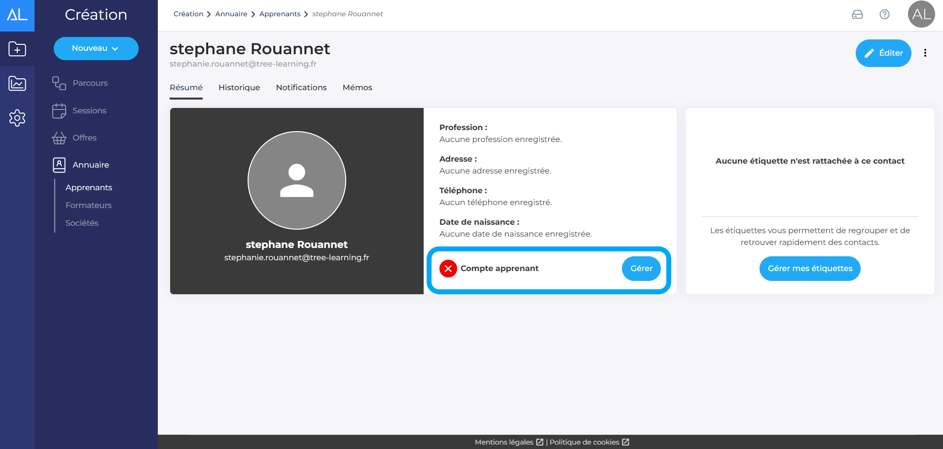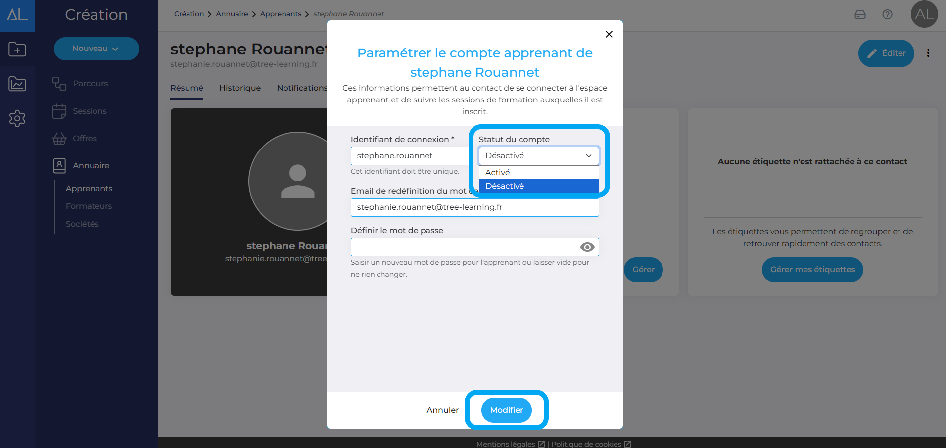 En cliquant sur « Gérer », vous pouvez activer (ou désactiver) le compte apprenant.