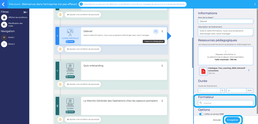 Pour terminer le processus de création de la classe présentielle, n’oubliez pas d’indiquer dans le menu à droite le nom du formateur ainsi que la durée de la classe.