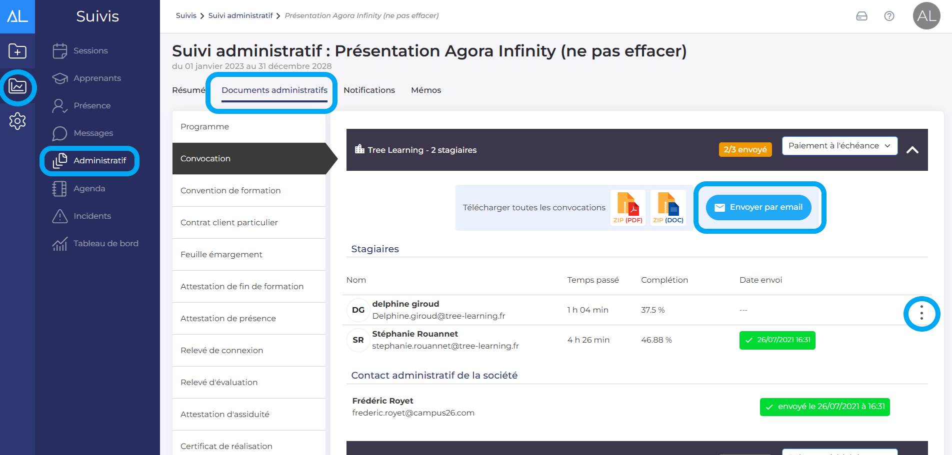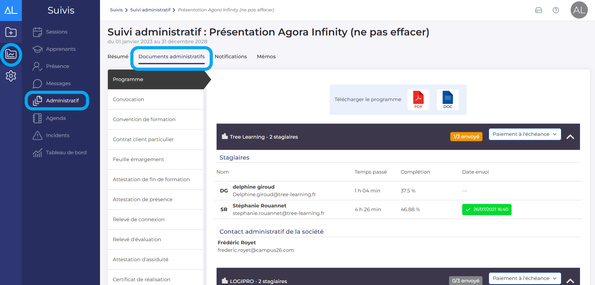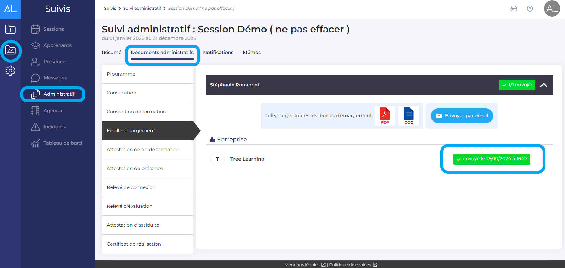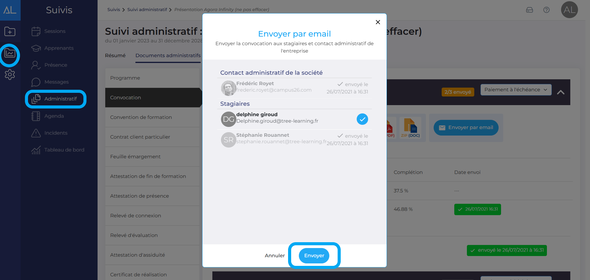 Si vous voulez envoyer des documents à vos apprenants ou aux entreprises de vos apprenants, allez dans “Suivez” puis “Administratif”. Sélectionnez la session à partir de laquelle vous voulez envoyer des documents.