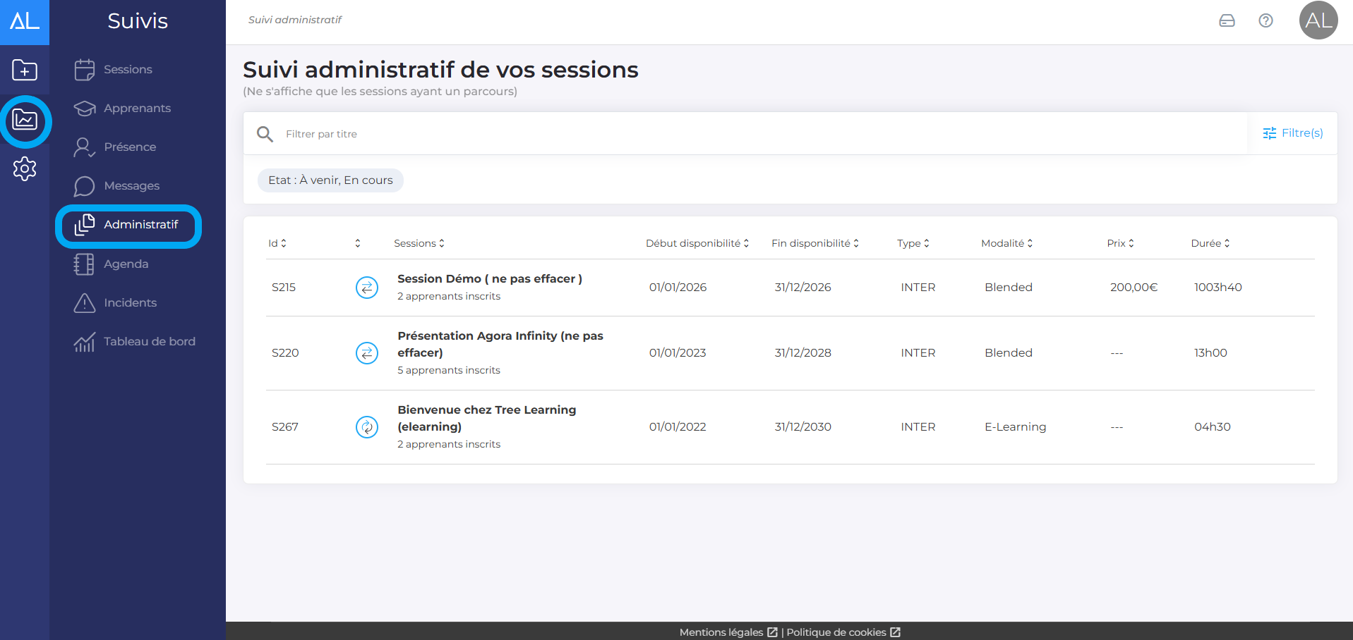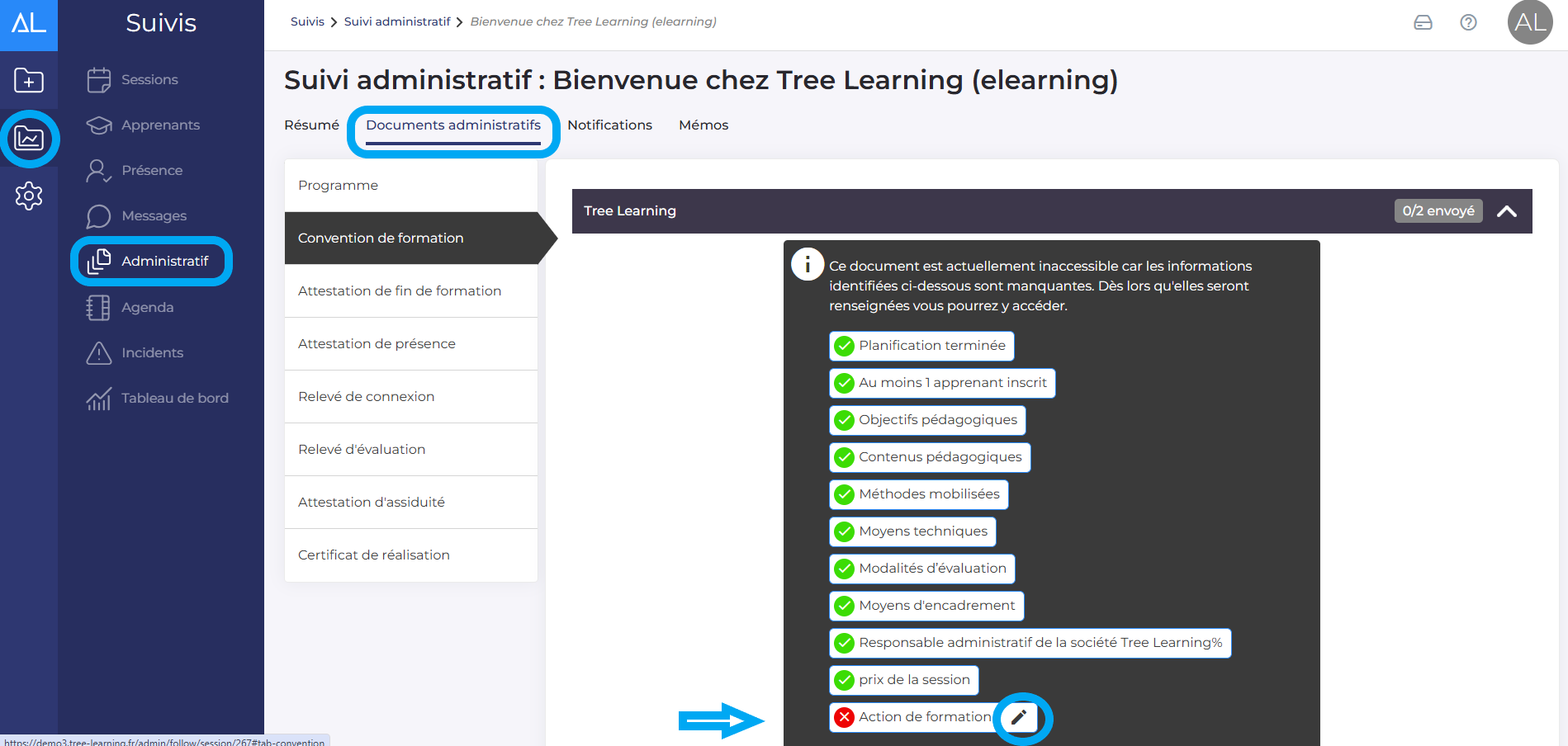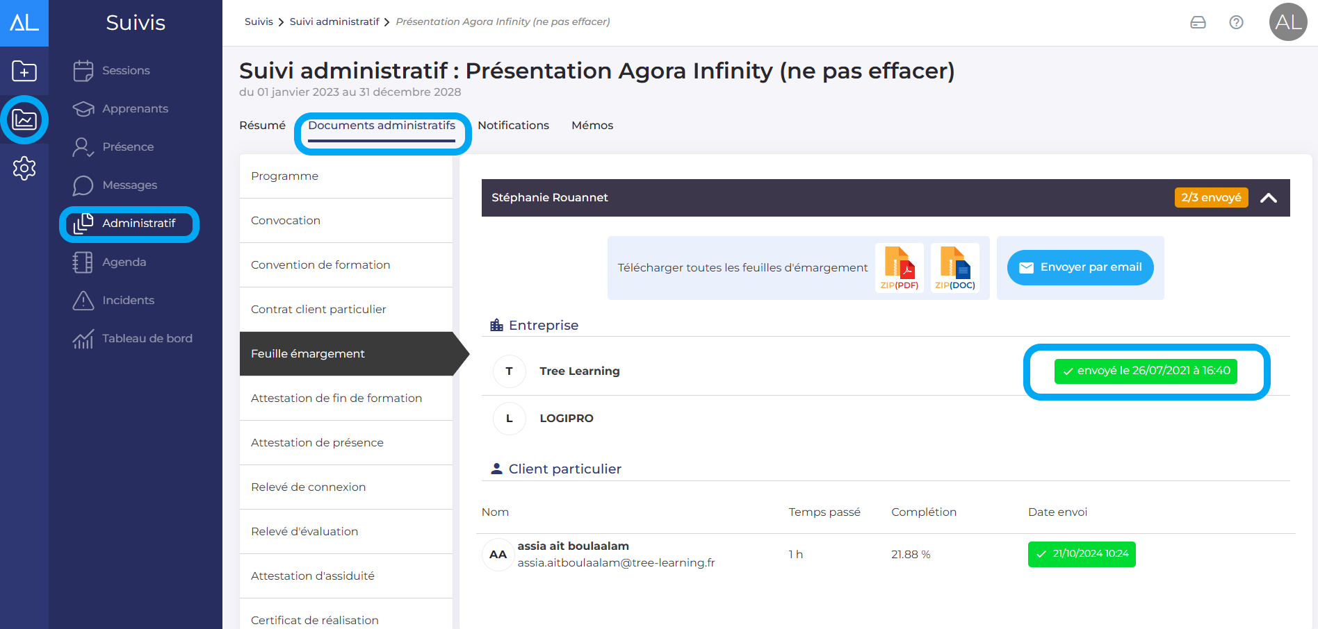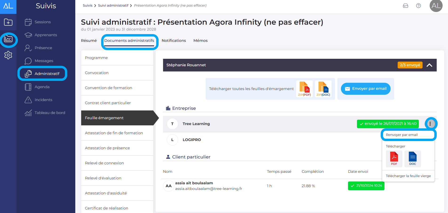 Si vous voulez envoyer des documents à vos apprenants ou aux entreprises de vos apprenants, allez dans “Suivez” puis “Administratif”. Sélectionnez la session à partir de laquelle vous voulez envoyer des documents.