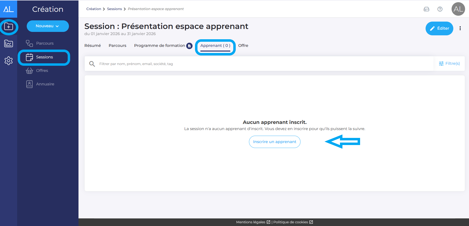 Ensuite, choisissez la session dans laquelle vous voulez inscrire votre apprenant, cliquez sur l’onglet “Apprenants” et « inscrire un apprenant ».