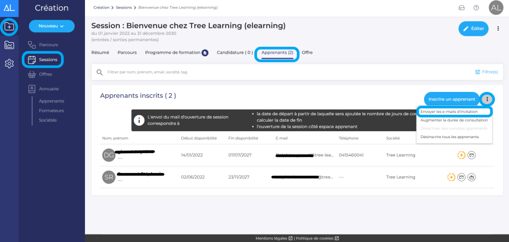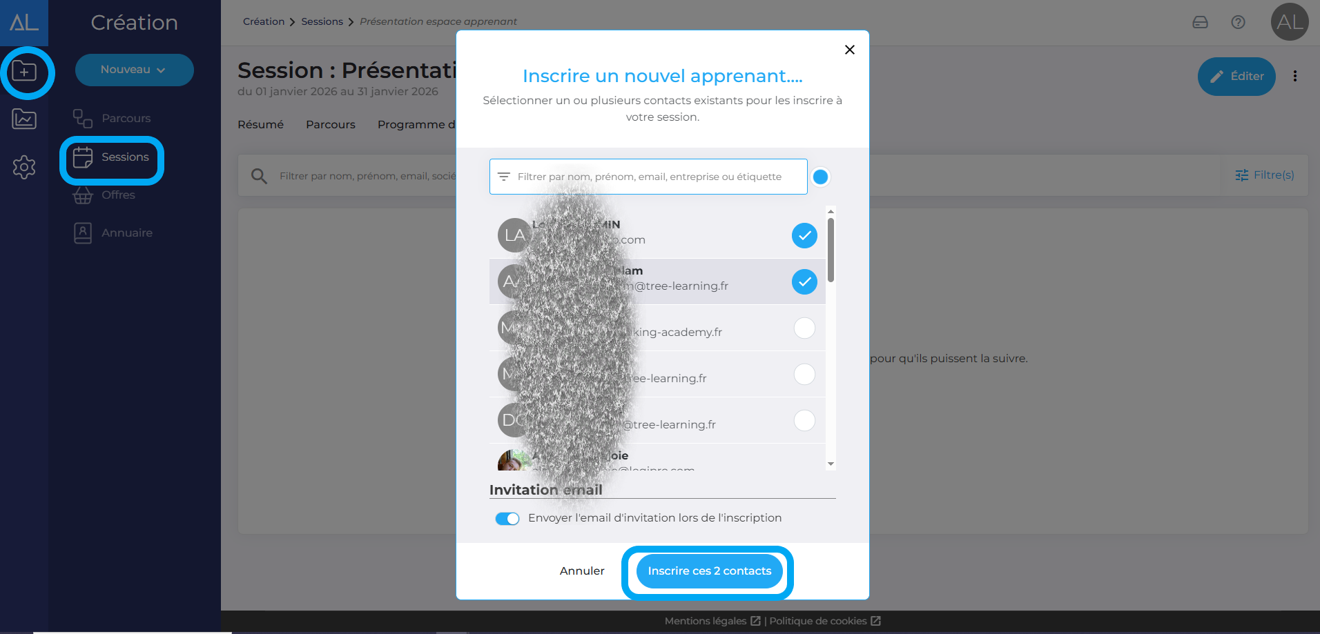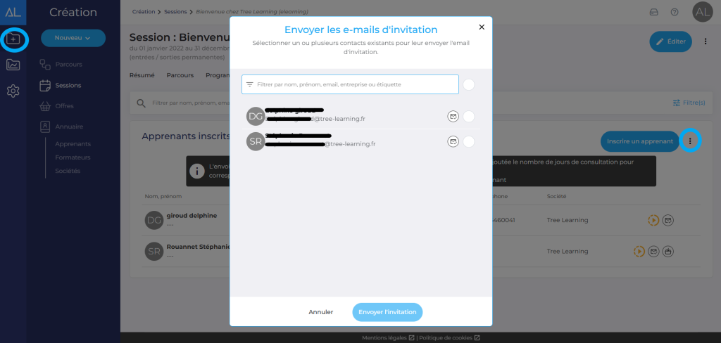 Une fois l’inscription de votre apprenant effectuée, vous pouvez lui envoyer un email pour l’informer de son inscription. Toujours dans la session qui vous intéresse, cliquez sur “Apprenants”. Choisissez le contact que vous souhaitez informer, allez sur les 3 petits points à droite, et cliquez sur “Envoyer l’email d’invitation”. Vous pouvez également choisir d’informer plusieurs contacts avec la sélection multiple. Cet envoi est possible autant de fois que nécessaire.