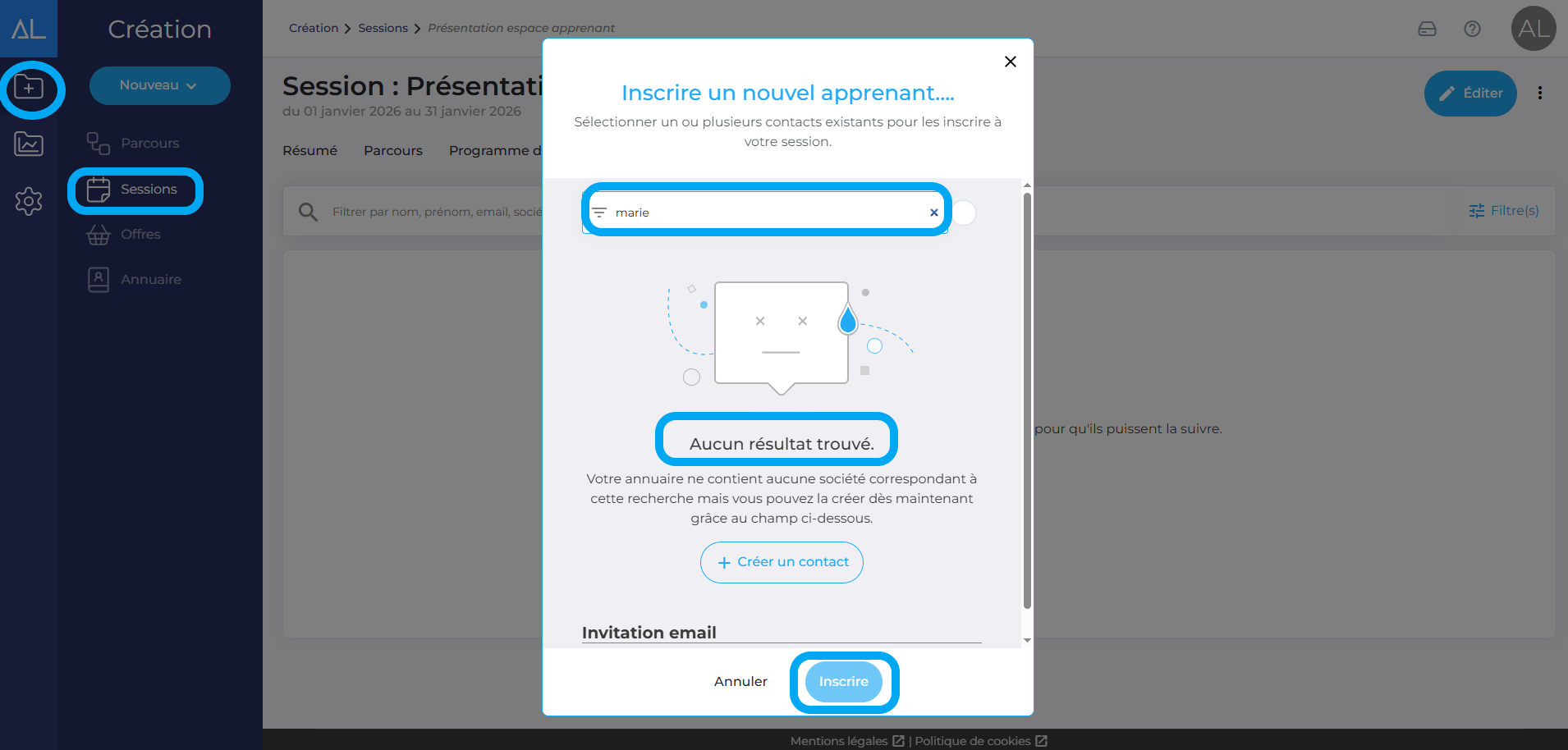 Si celui-ci existe déjà sur la plateforme, il vous suffira seulement de le sélectionner dans la liste. Si l’apprenant n’est pas créé sur la plateforme, allez dans “Créer un contact” lors de votre recherche.