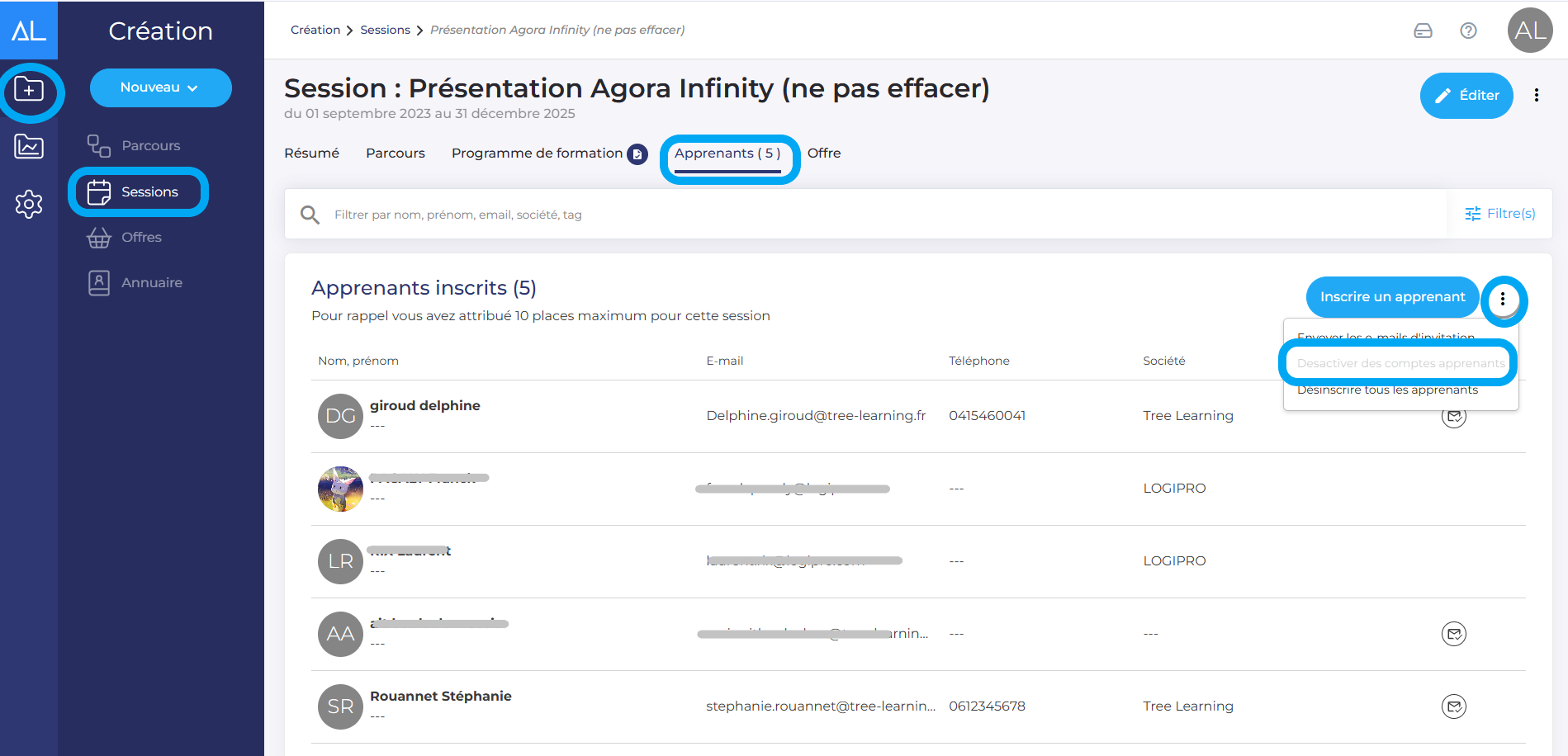 - Dans l’onglet « Apprenants » (de la session de formation), dans le menu 3 points à côté du bouton « Inscrire un apprenant », l’action « Désactiver des comptes apprenants » permets de désactiver tous les apprenants de la session.