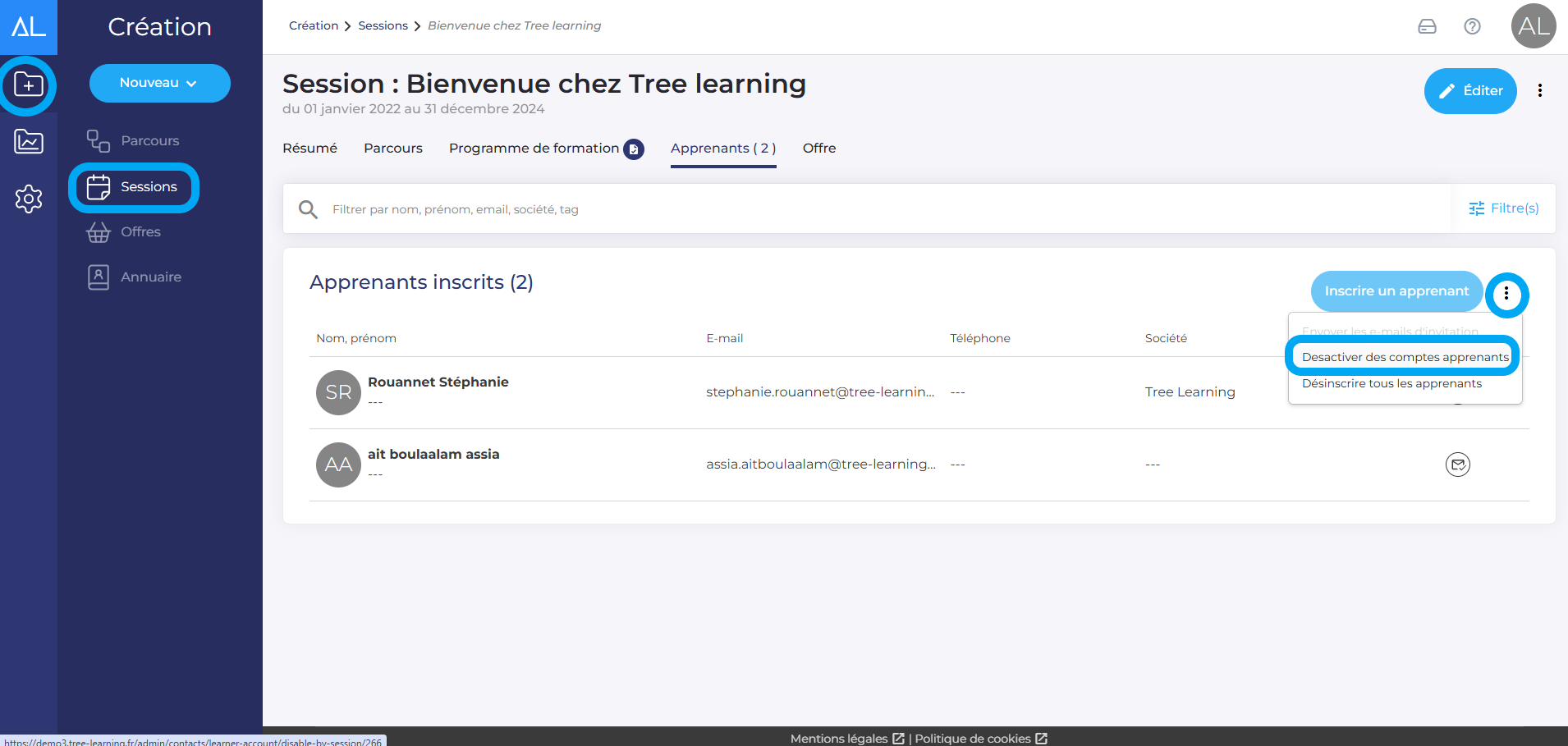 Vous avez 2 possibilités pour désactiver des comptes apprenants en masse: par session de formation (à la date de fin) ou via l’annuaire pour désactiver tous les comptes apprenants n’étant pas rattachés à une session en cours.