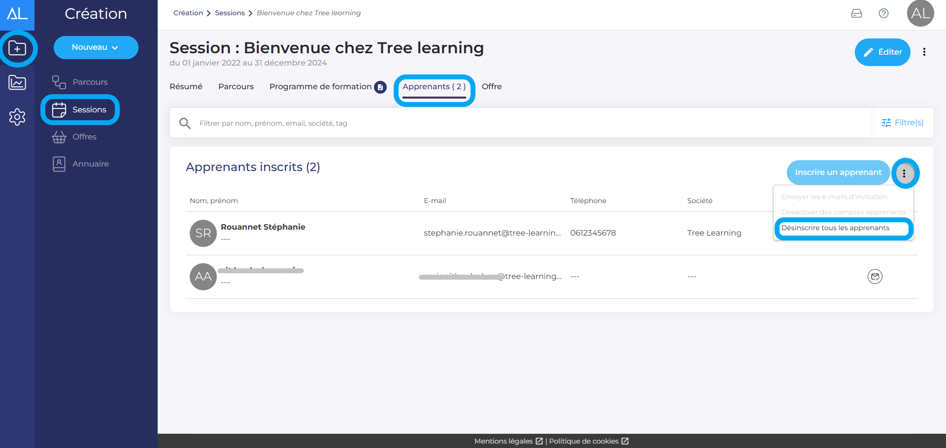 Dans l’onglet « Apprenants » (de la session de formation), dans le menu 3 points à côté du bouton « Inscrire un apprenant », l’action « Désinscrire tous les apprenants » permets de désinscrire tous les apprenants de la session.