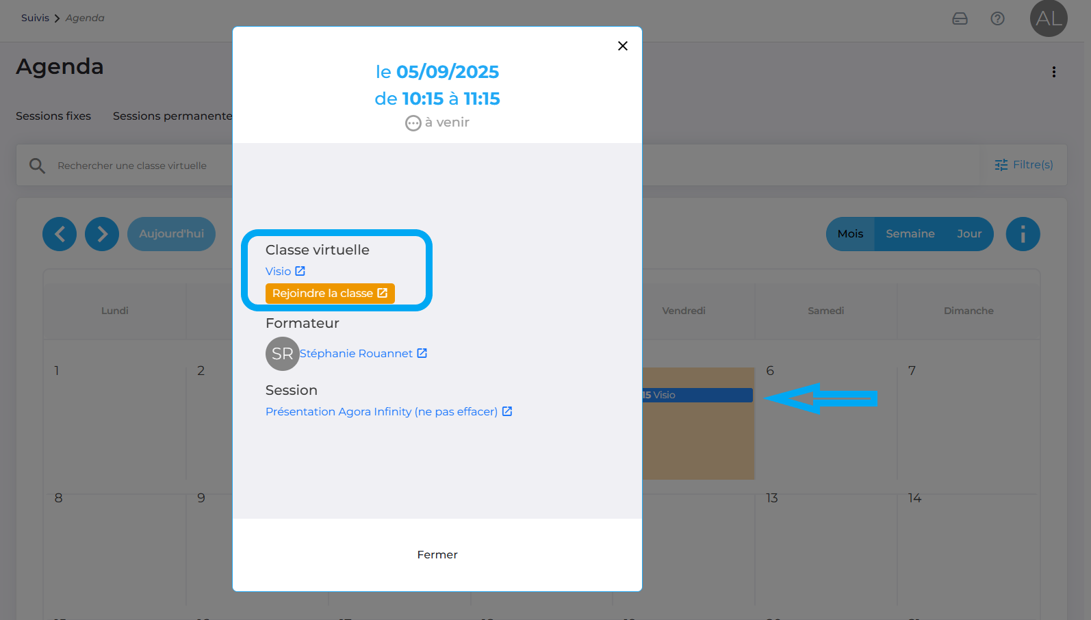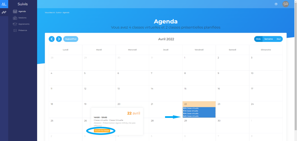Identifiez-vous sur la plateforme Agora Infinity. En tant que formateur, depuis les paramètres à gauche, vous aurez accès au suivi des sessions, au suivi de vos apprenants et à votre agenda.