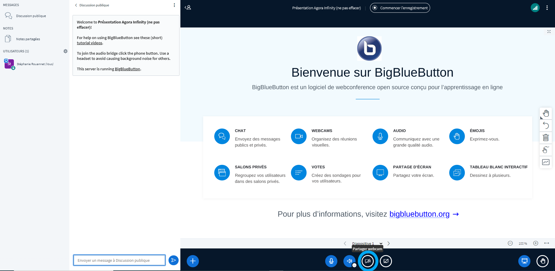 Vous pouvez également dans un même temps activer votre webcam pour accueillir vos apprenants.