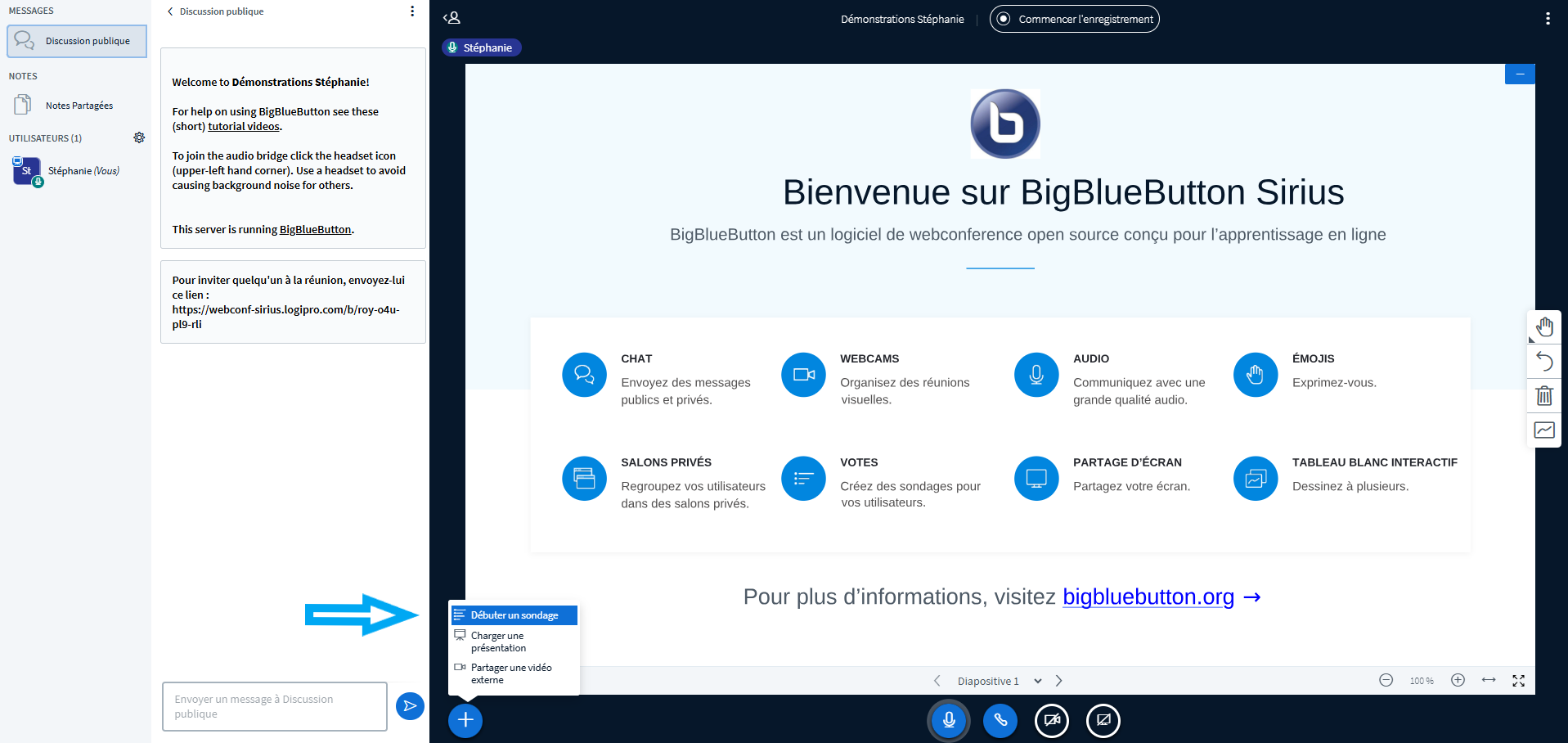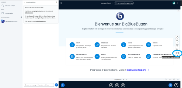 Une fois vos apprenants connectés dans la barre du menu à gauche, vous pouvez commencer votre classe. Ils auront la possibilité de communiquer avec vous par le chat pendant la formation, ou bien de s’adresser directement à vous en prenant la parole.