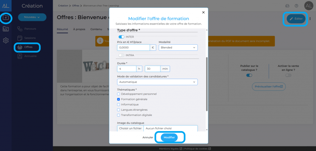 - Attention, si vous modifiez le contenu d’une offre, celui-ci ne sera pas pris en compte dans les sessions qui y sont associées.