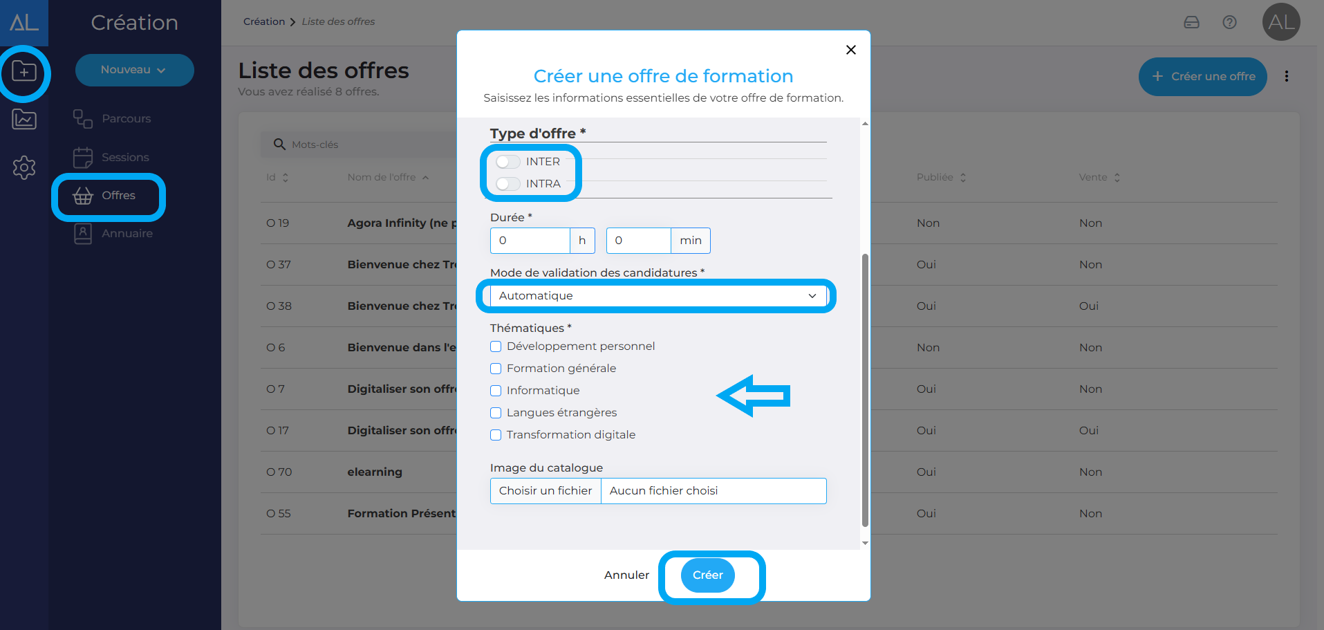 Avant de déposer une session dans votre catalogue de formation, il vous faudra d’abord créer une offre, rendez-vous dans “Création” puis “Offres”.