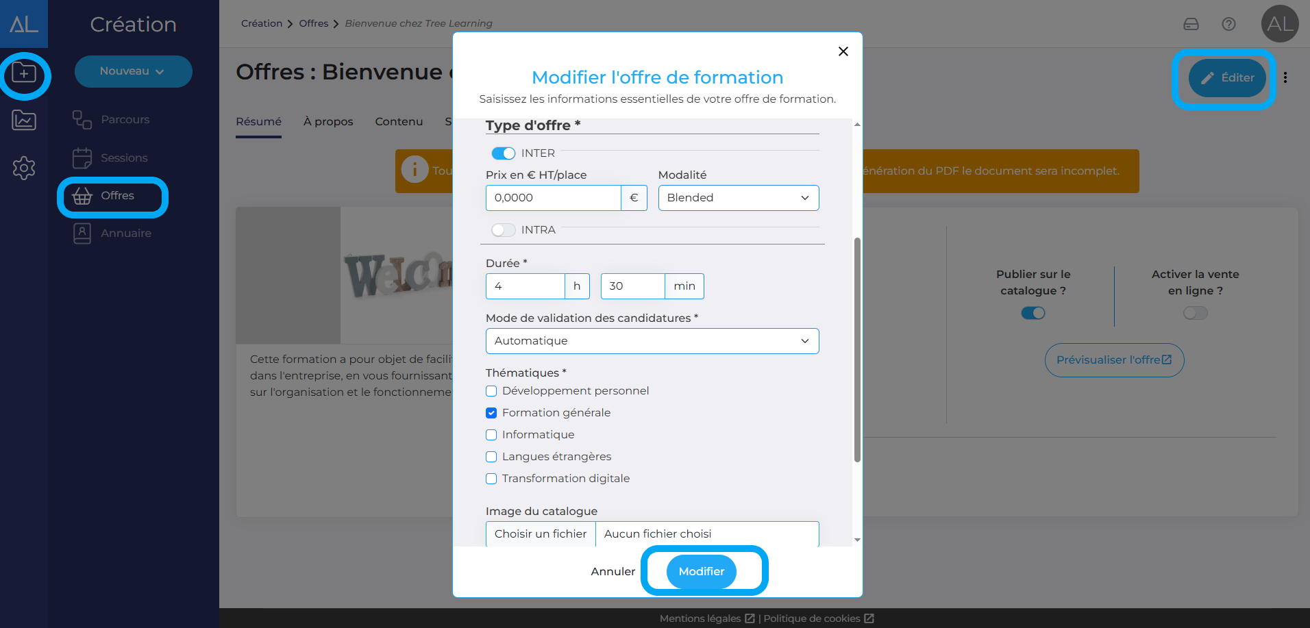 Attention: si vous modifiez le contenu d’une offre, celui-ci ne sera pas pris en compte dans les sessions qui y sont associées.