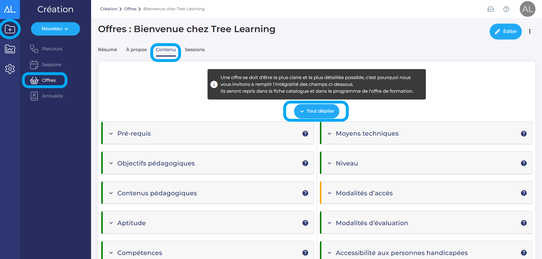 Dans “contenu”, vous pouvez aussi modifier le programme de formation qui sera associé à l’offre (les contenus pédagogiques, les publics cible…)