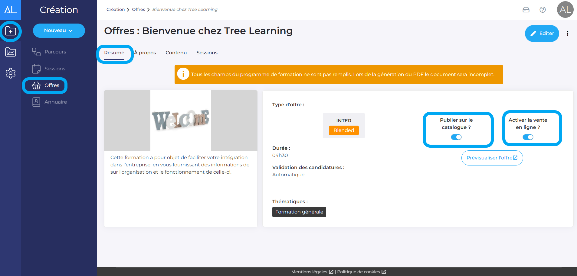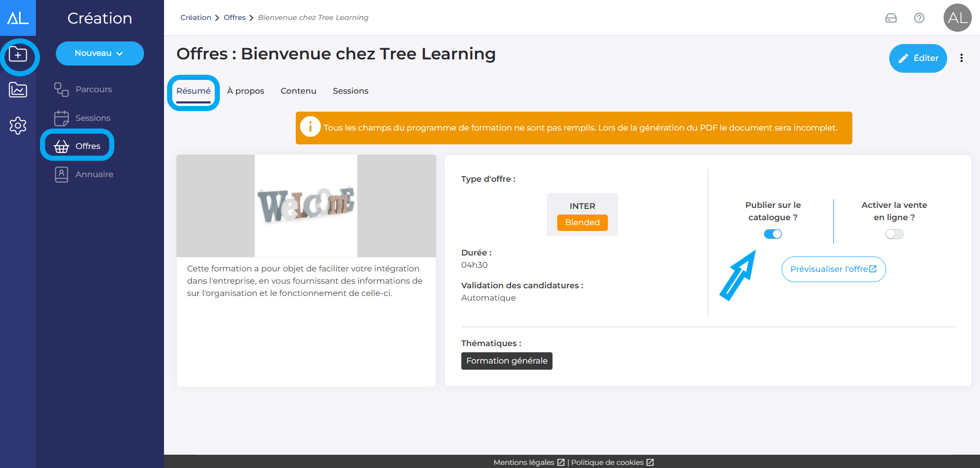 - « Activer la vente de l’offre en ligne », cela permettra à un apprenant ou un prospect de pouvoir acheter votre formation depuis l’offre visible dans l’espace catalogue
