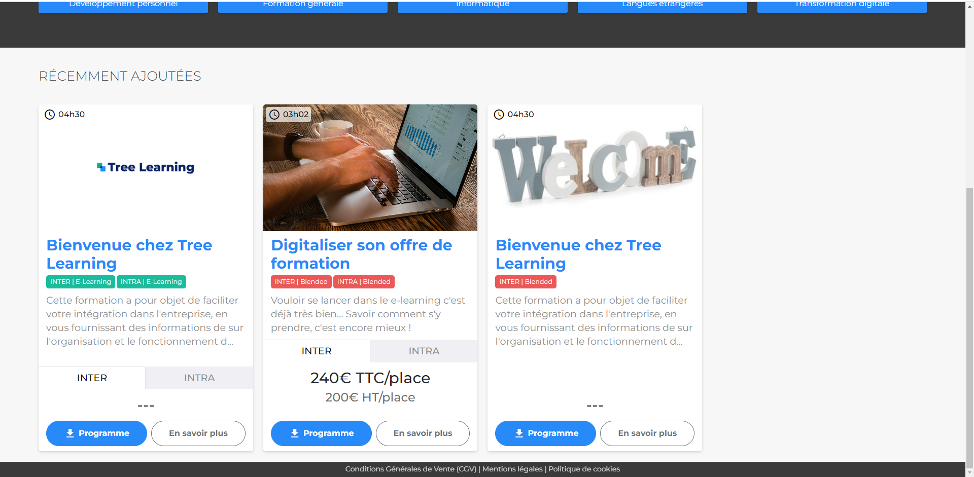Dans ce cas, on aura un prix HT/ place pour de l’inter entreprise et un prix “à partir de” pour de l’intra (prix par groupe).