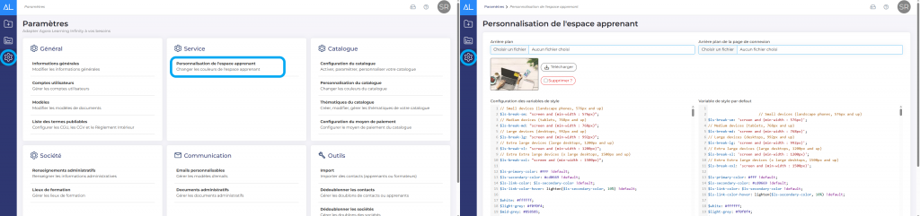 Dans ”Paramètres” > ”Services” puis “Personnalisation de l’espace apprenant”, vous pourrez modifier les couleurs et l’arrière-plan de votre espace.