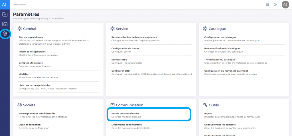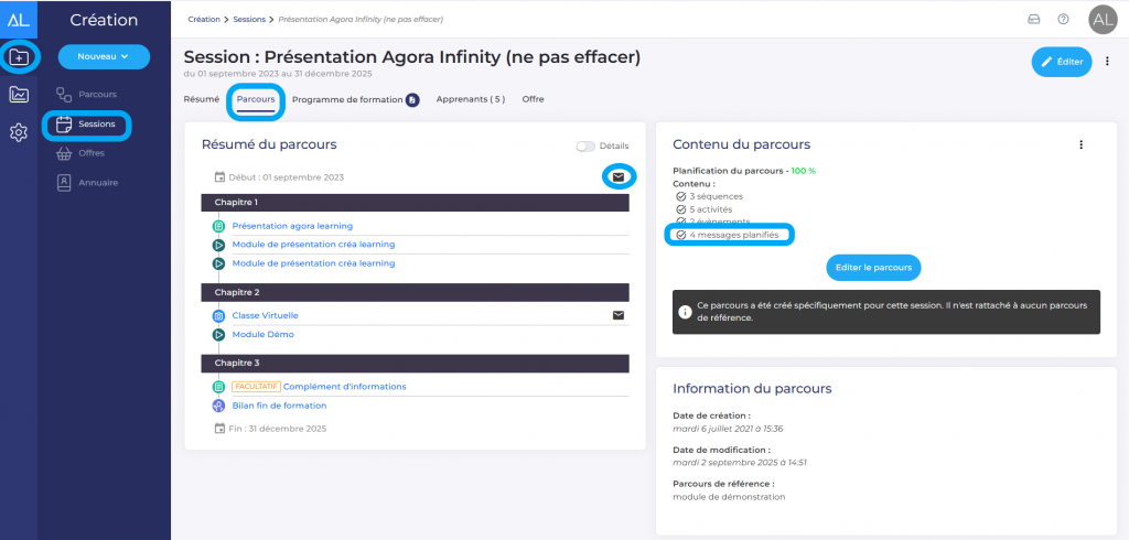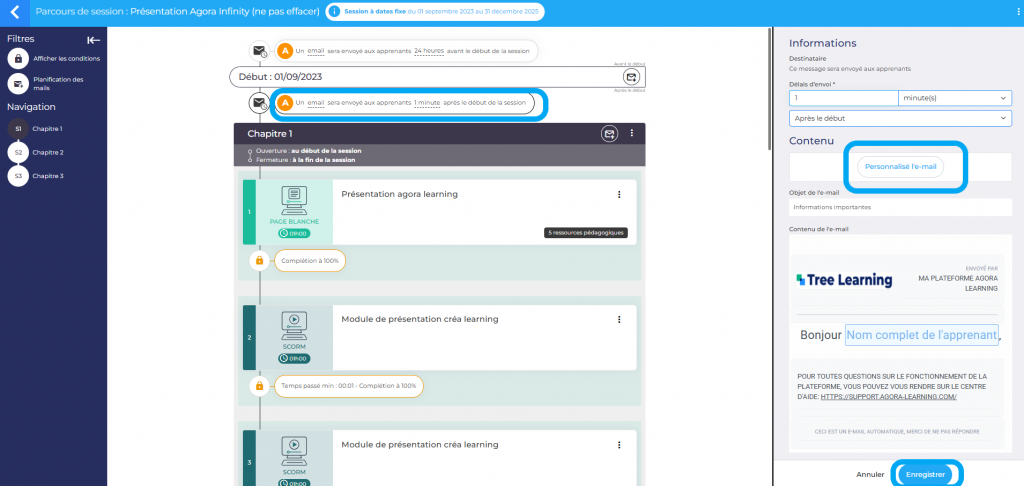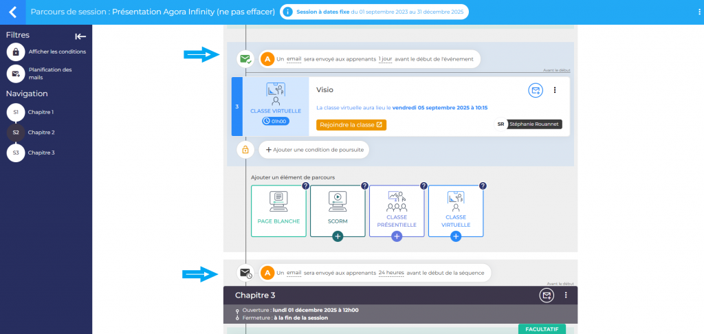 Vous pouvez planifier les mails dans le parcours de référence ou sur le parcours de la session.