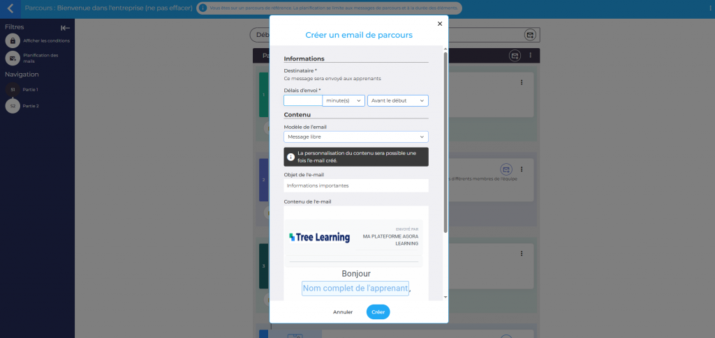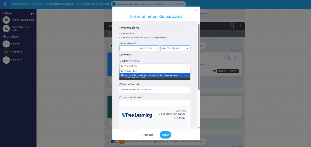 - Vous pouvez planifier un mail libre depuis le parcours (de référence ou de la session):
