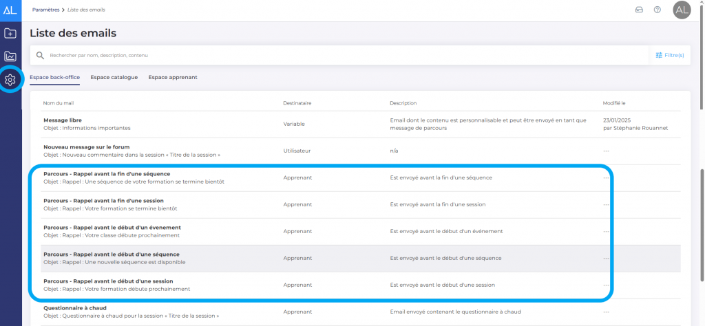 Vous pouvez planifier un mail de rappel prédifini pour une classe virtuelle, en présentiel, pour le début ou la fin d’une session, et/ou d’une séquence.