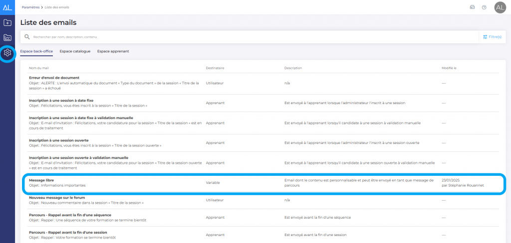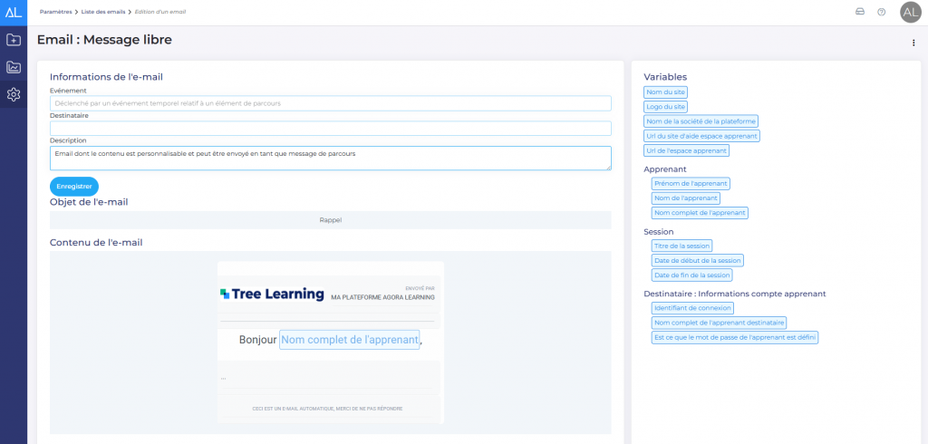 - Vous retrouverez dans la liste des emails personnalisables (paramètres) le mail libre qui est totalement éditable, ainsi que l’objet du mail: