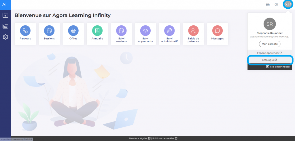 Pour accéder au catalogue de la plateforme Agora Learning Infinity en mode front, il faudra positionner votre souris en haut à droite sur vos initiales (ou votre photo). Cliquez et allez dans “Catalogue”.