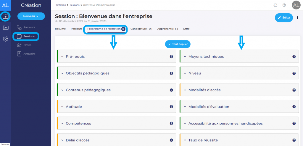 Le programme de formation dans le parcours est automatiquement intégré dans la session.