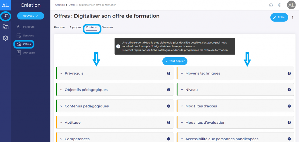Le programme du parcours est dupliqué automatiquement dans la session, néanmoins, il est possible de modifier le contenu du programme de session au besoin. Les champs renseignés sont utilisés dans les documents programme de formation, attestation de fin de formation, et convention ainsi que dans le programme de formation téléchargeable côté catalogue.