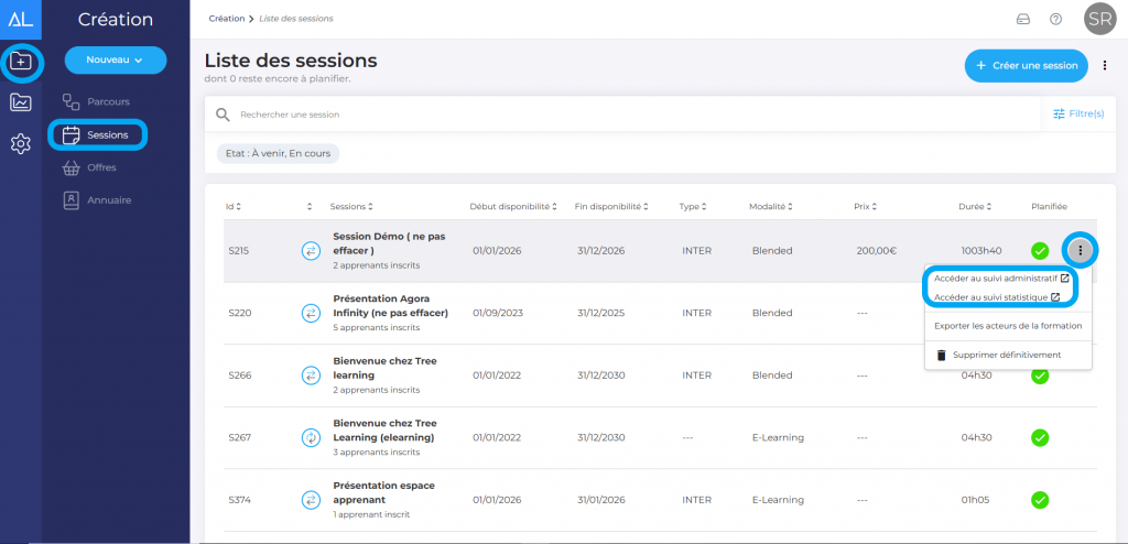 Depuis la liste présente dans « création> session », dans le menu 3 points de chaque session, vous pouvez accéder au suivi administratif (documents liés à la session, notifications d’envoi de documents ou d’emails, mémos) et au suivi statistique (suivi de l’avancement des sessions, complétion, temps passé, etc).