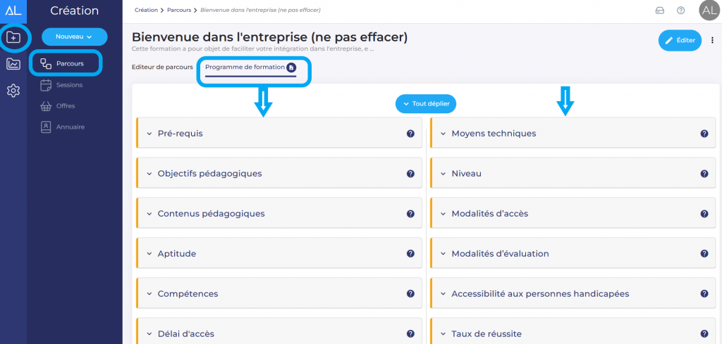 Se rendre sur “Créez”, puis “Parcours”. Choisissez le parcours pour lequel vous souhaitez modifier ou créer le programme de formation. Allez dans la partie “Programme de formation”.
