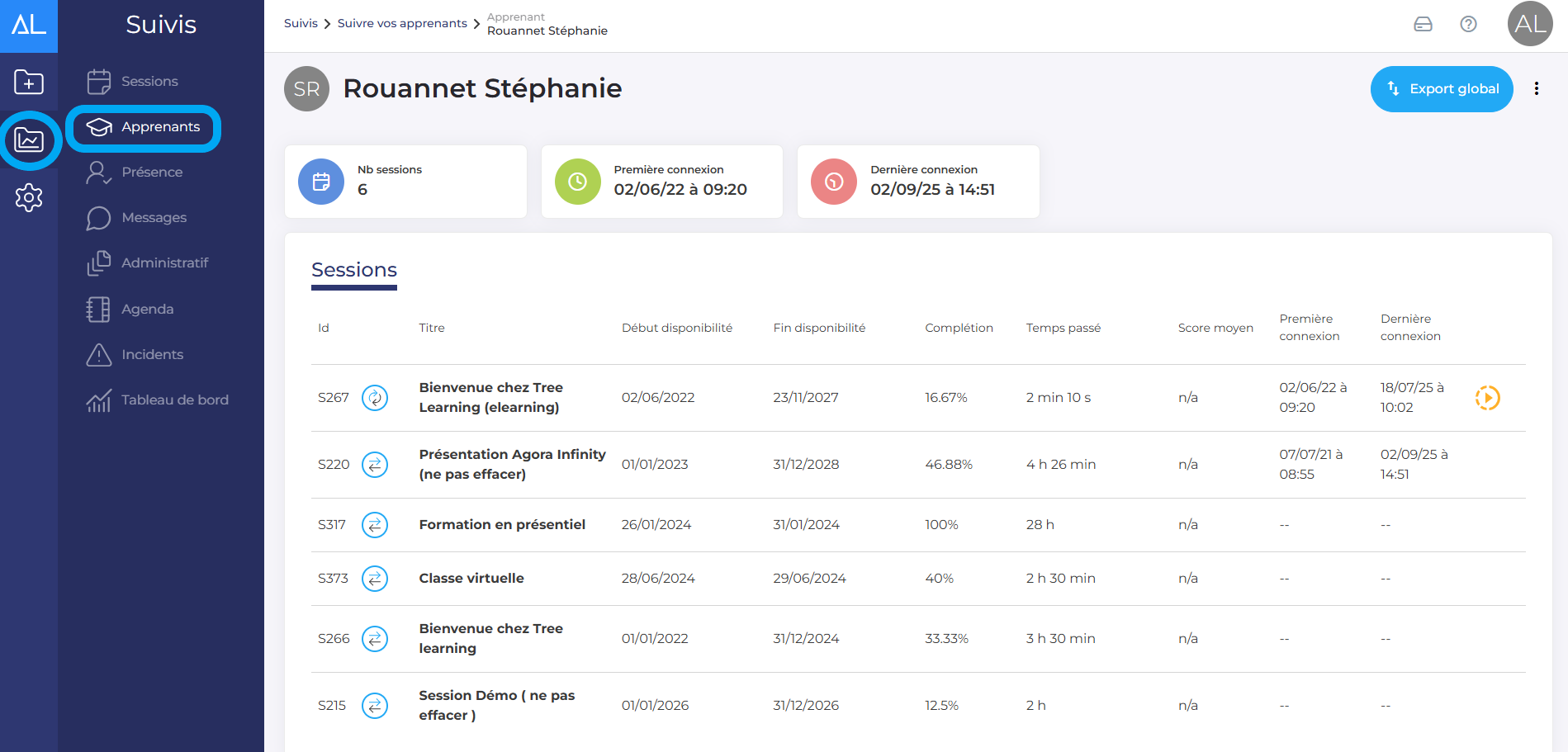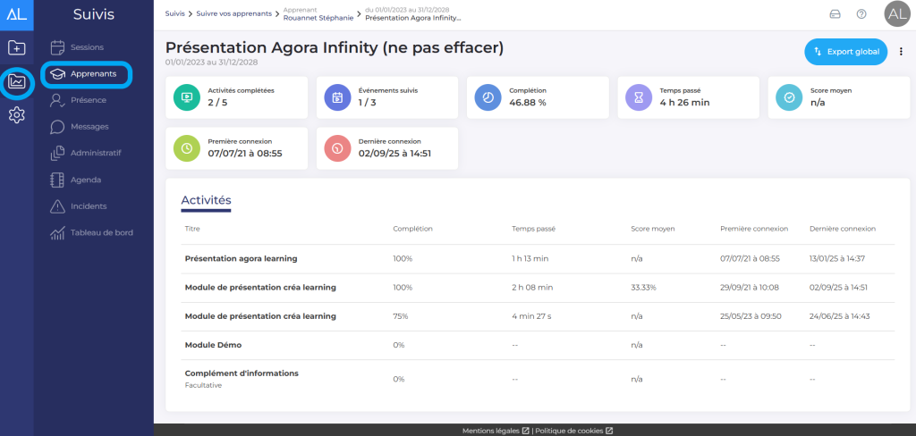 Pour suivre un apprenant, cliquez sur “Suivez” et choisissez “Apprenants”. Cliquez ensuite sur l’apprenant que vous voulez suivre. Vous pourrez obtenir tout le détail de ses parcours de formation :