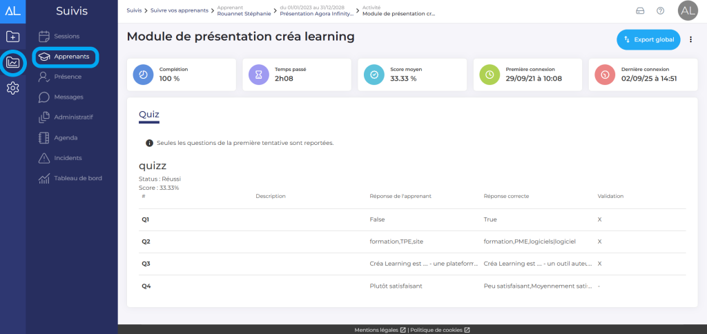 En cliquant sur la session, vous verrez le détail exact de l’apprenant pour chaque activité de la session. En cliquant sur l’activité, vous aurez le résultat de toutes ses réponses.