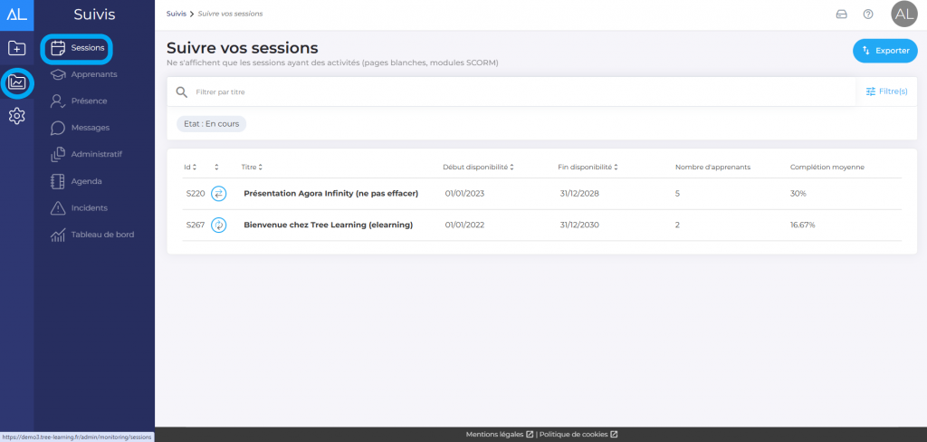Pour accéder au suivi d’une session, cliquez sur “Suivez” puis “Sessions”. Vous retrouverez la liste de toutes vos sessions sur le menu, avec pour chacune le nombre d’apprenants inscrits et le taux de complétion moyen.