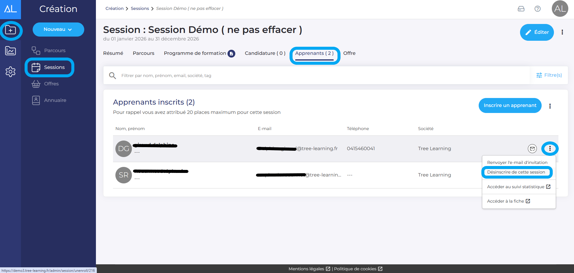 Vous pouvez désinscrire l’apprenant de la session via les 3 points à droite de son nom.