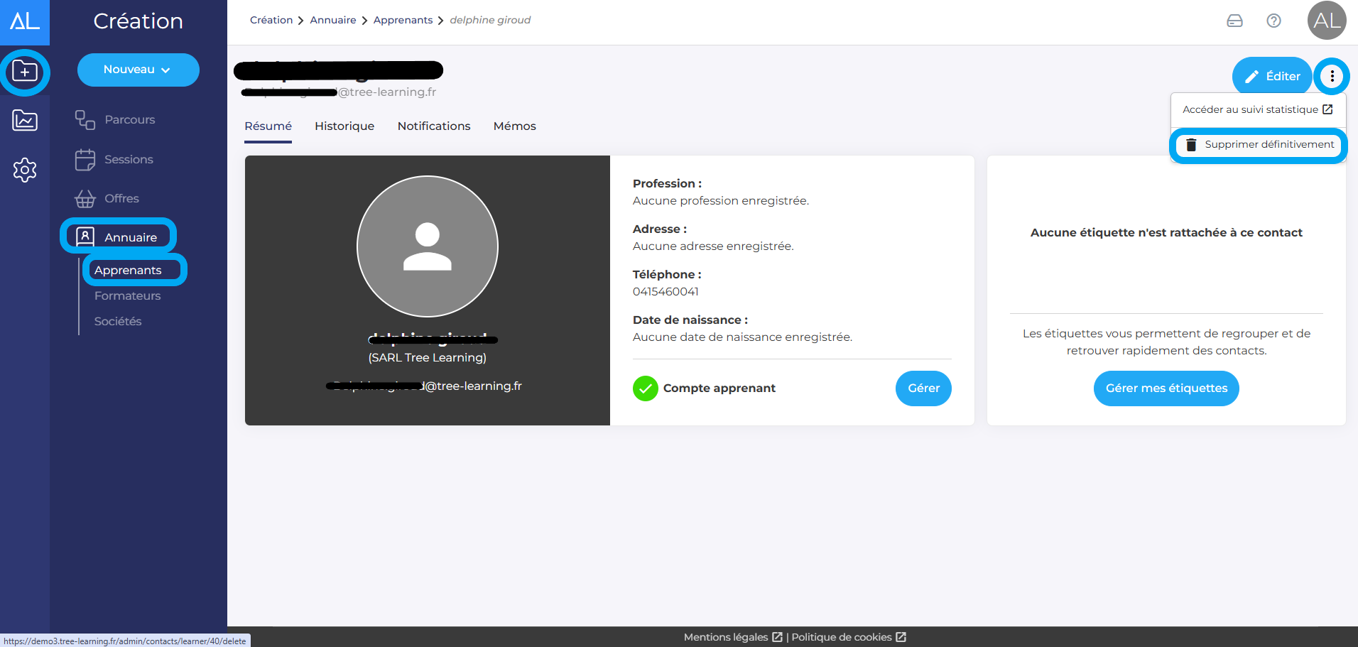 Pour supprimer définitivement un contact (apprenant, formateur), il faut tout d’abord que celui-ci ne soit plus relié à aucune session de formation. Toute suppression est définitive et vous n’aurez plus aucune statistique concernant le contact.